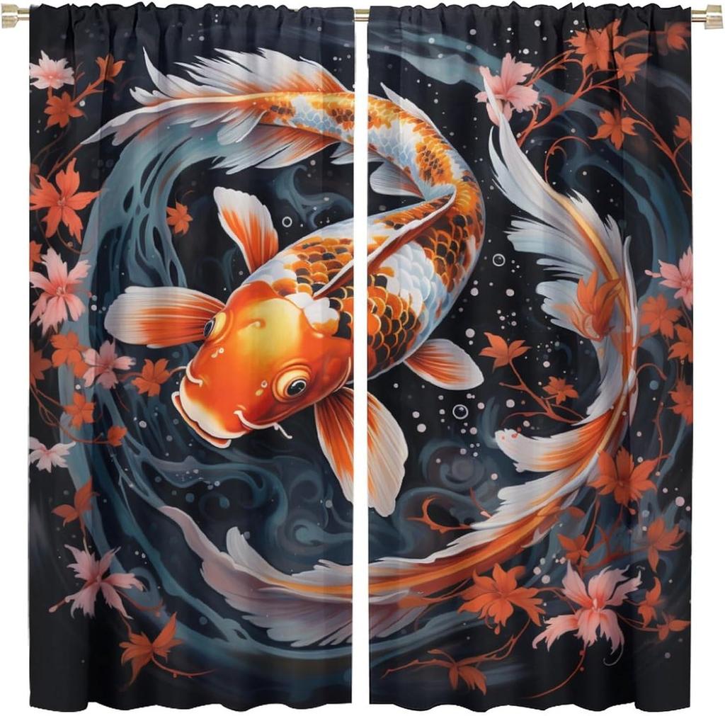 Japanese Wave Curtain Fantasy Anime Koi Fish Black Background Oriental Japanese Sea Wave Flower Art Pole Pocket Blackout Curtain