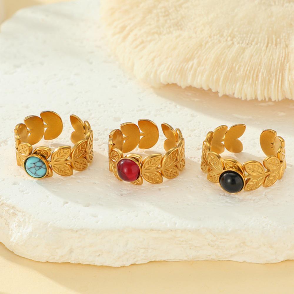 Bohemian Style Adjustable Turquoise Leaf Ring - Stainless Titanium Steel, Non-Fading