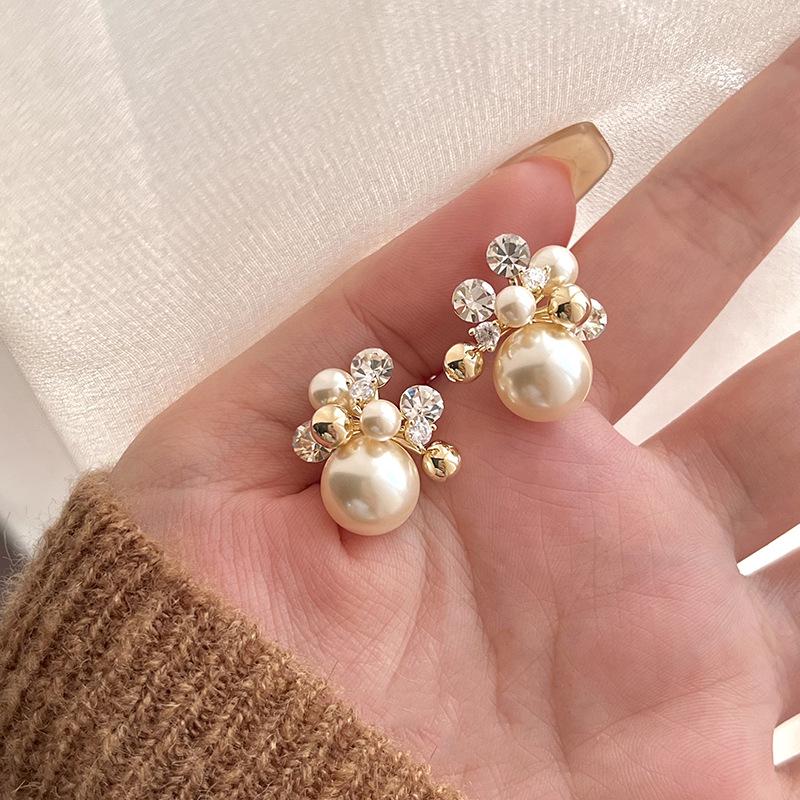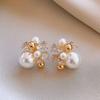 Gold-Plated Silver Zircon Flower Pearl Stud Earrings - French Retro Style for Women