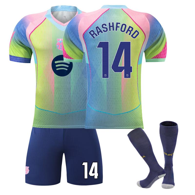Adolescentes Crianças Adultos Nome Personalizado Kits de Futebol 25/26 Barça Azul-Verde #14 Rashford Conjunto de Camisa de Treino Esportivo com Meias