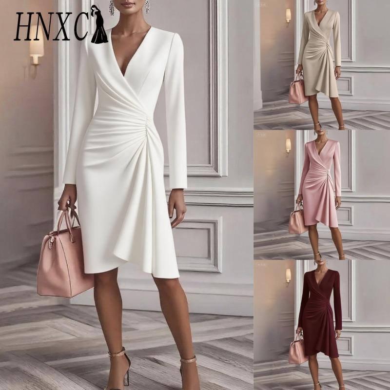 HNXC Moda feminina outono inverno cor sólida estampa manga comprida decote em v vestidos casuais