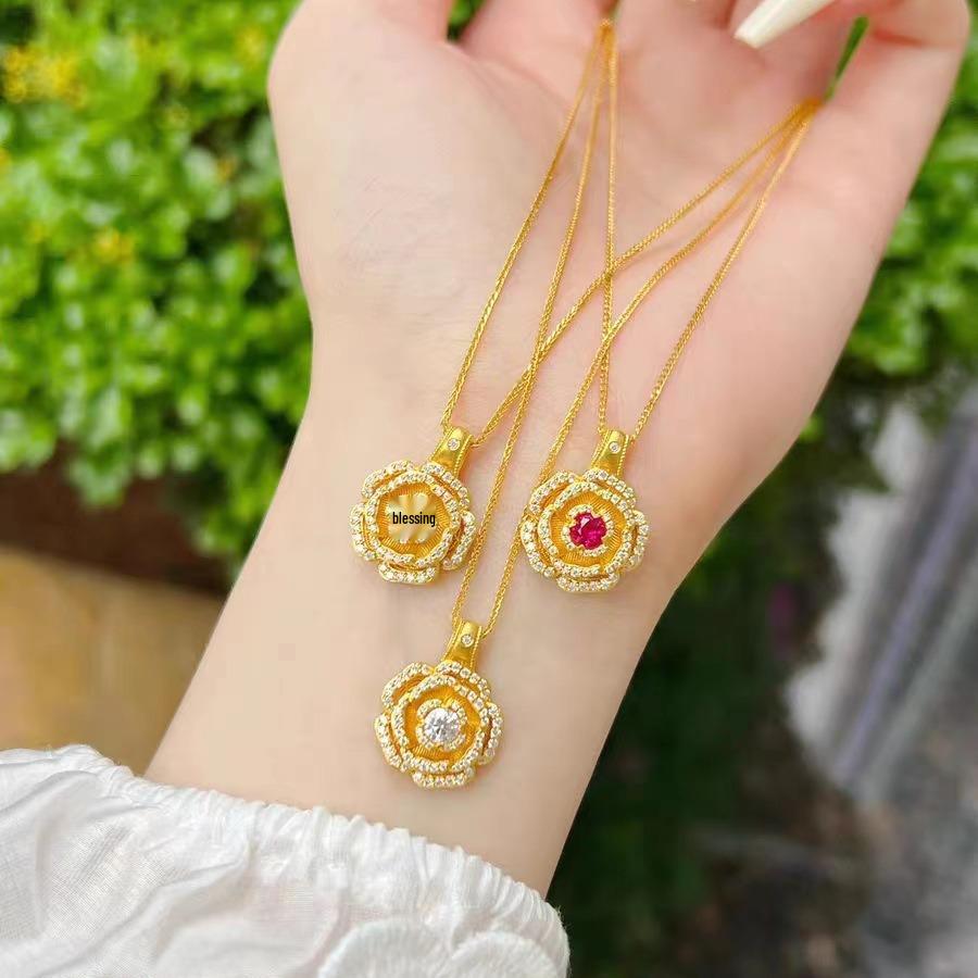 Elegant Vietnamese Sand Gold Enamel Rose Flower Pendant Necklace