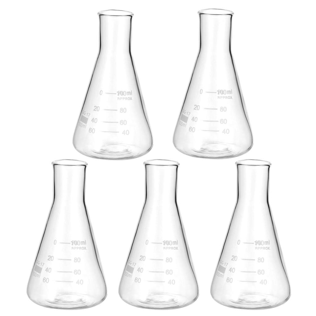 Specifications: Color: Transparent; Material: High Borosilicate Glass; Capacity: 100ml/3.4oz; Total Height: 105mm/4.13in; Base Diameter: 62mm/2.44in; Mouth Outer Diameter: 27mm/1.06in; Contents: 5 Erlenmeyer Flasks