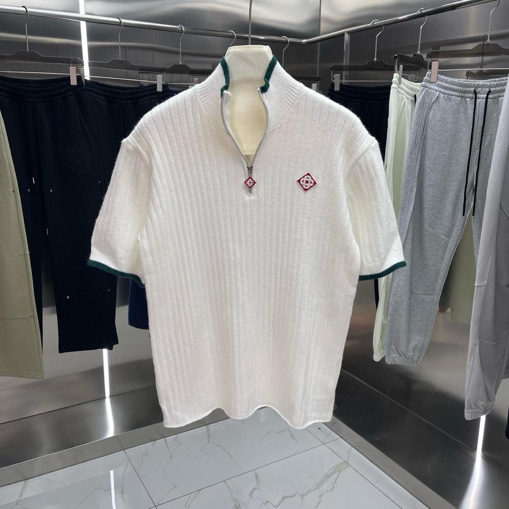 Suéter Camiseta de Malha de Manga Curta Transfronteiriço Europeu-Americano com Gola Alta e Logo Bordado no Peito