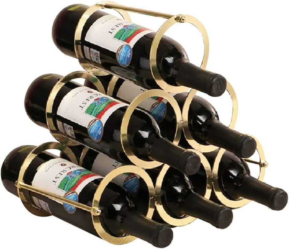 Este elegante suporte de metal para garrafas de vinho tem um toque medieval europeu. Possui uma textura suave e um design inovador e criativo com círculos sobrepostos. É feito de ferro durável.