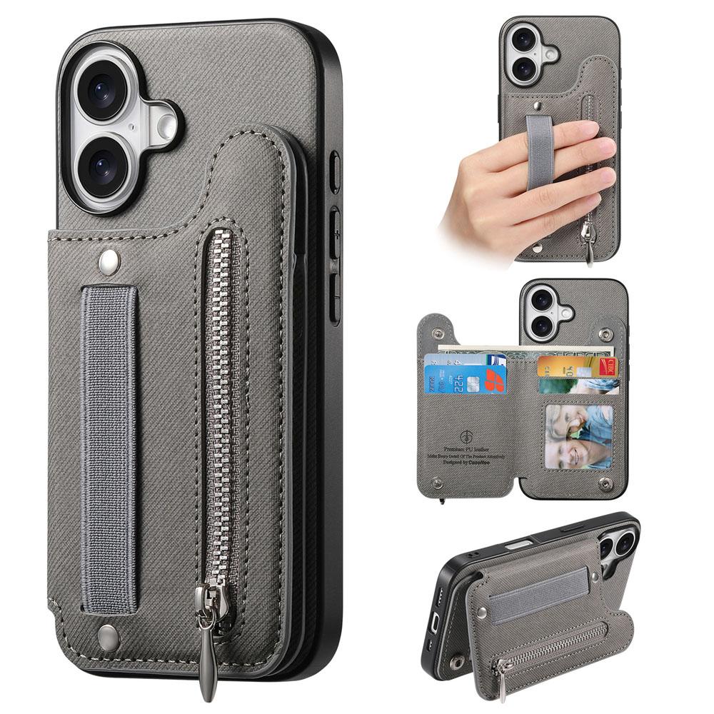 Zipper Cards Solt Wallet Leather Case for iPhone 16 15 13 Pro Max 14 Plus 16Pro 15Pro Elastic Rope Wrist Leather Cover