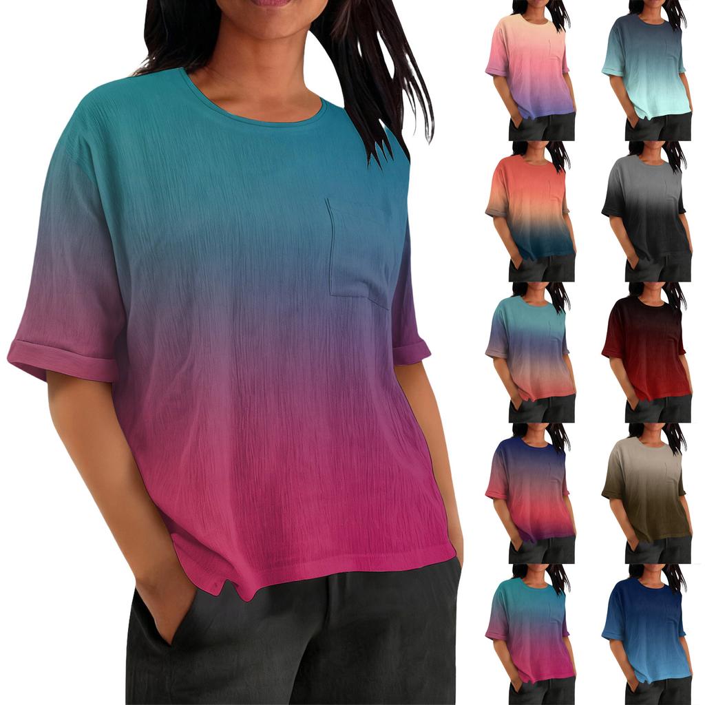Fashionable Women's T-shirt Short Sleeved Casual Top With Pocket Gradient Print Round Neck Lightweight Shirt