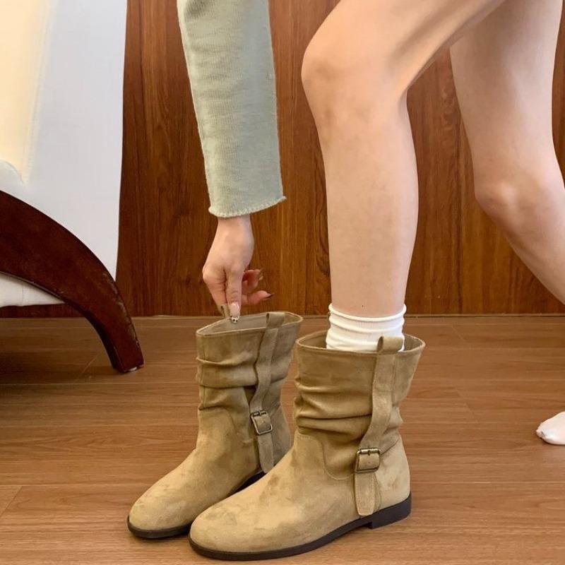 Simple design retro style flat bottom Martin boots women's autumn and winter wear suede round head commuting versatile medium boots