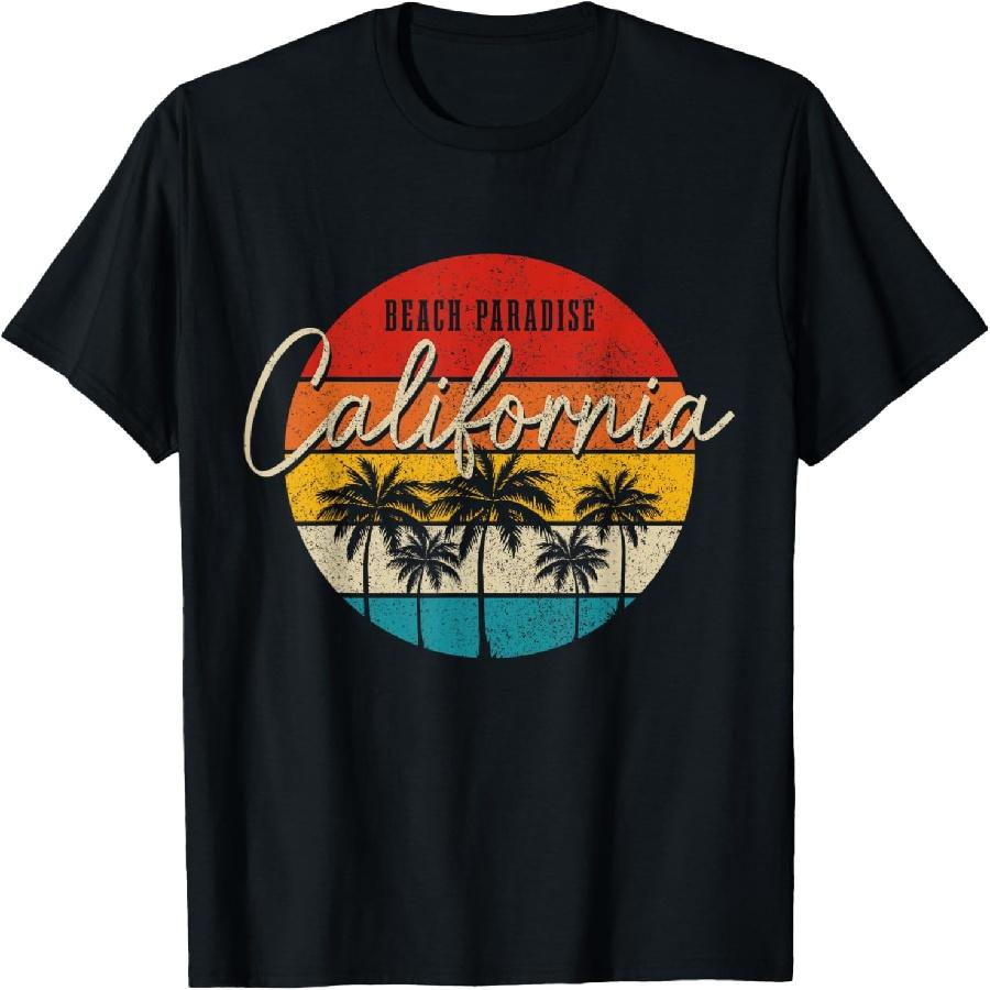 Paraíso de Praia na Califórnia Palmeiras Vintage Surfeista Retrô Camiseta Masculina Feminina Meninas Crianças