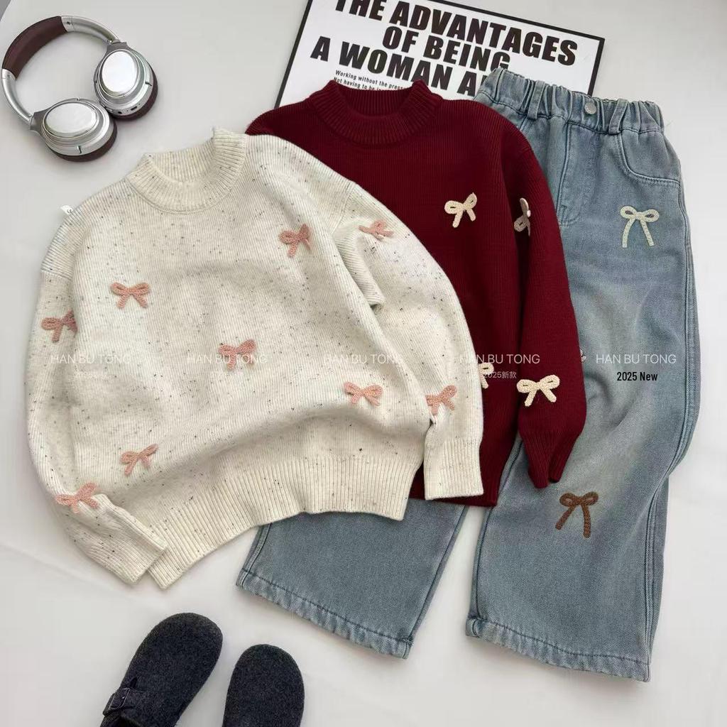 This stylish and cozy set is perfect for the cooler months. Featuring a warm autumn/winter knit pullover, it is designed with long sleeves to keep her comfortable and snug. The adorable bow detail adds a touch of charm to the set. Made from high-quality knitted material, this outfit offers both durability and comfort, making it a great choice for everyday wear or special occasions. The accompanying jeans complete the look, creating a fashionable and functional ensemble for any young girl's wardrobe.