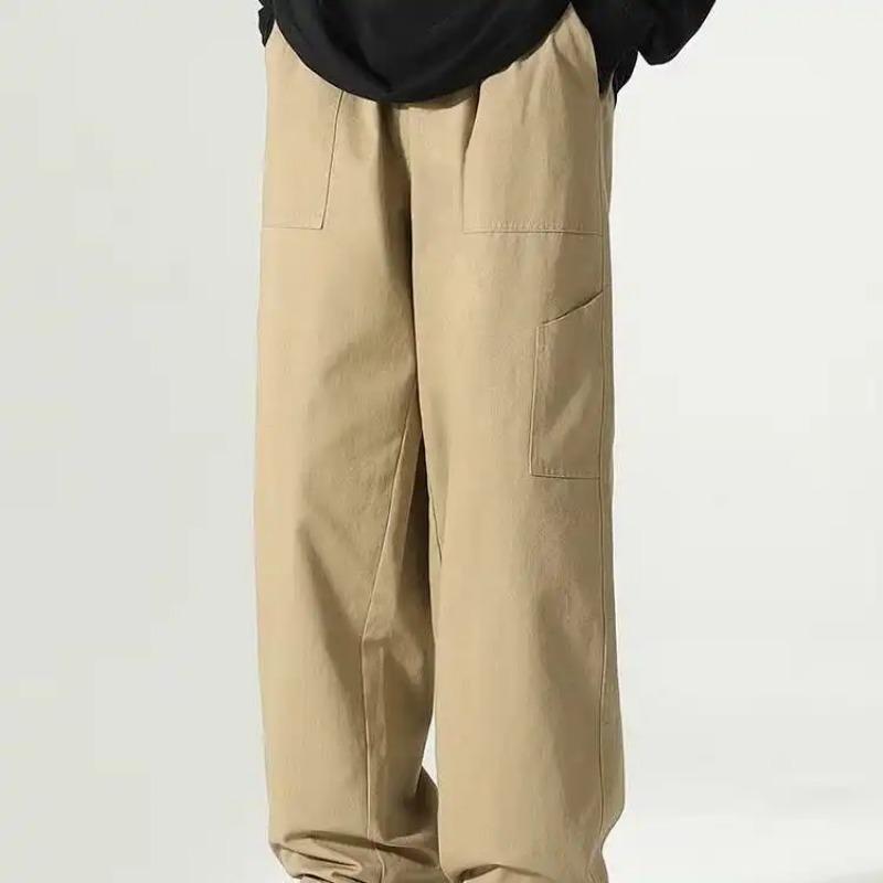 Calças Masculinas Casuais Streetwear Largas de Perna Reta Bolsos Laterais Cor Sólida Cáqui