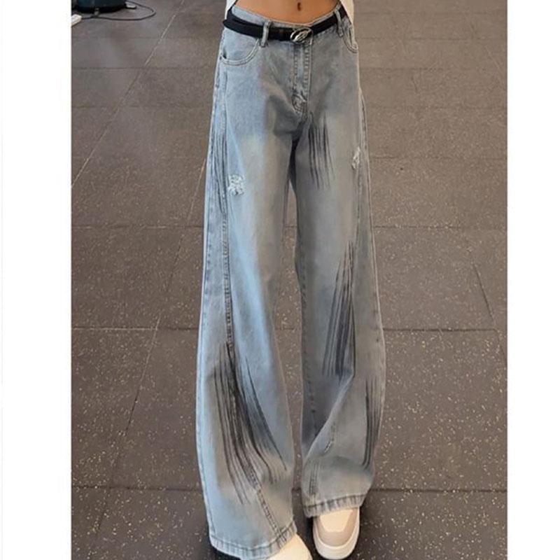 Women's Light Blue Low Waist Distressed Wide Leg Jeans Y2K Trendy Baggy Denim Pants