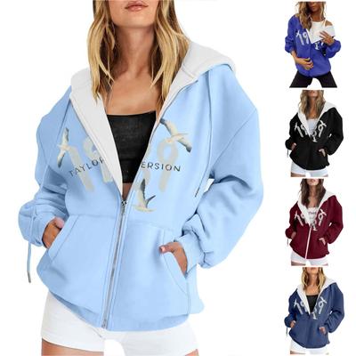 Moletom feminino estampado de manga comprida, jaqueta com bolso e zíper, casaco com capuz, outono