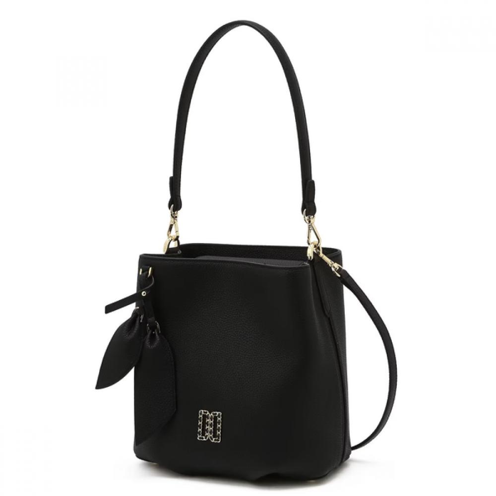 The DCBA6E332BK Black DD Logo Leather Shoulder Bag features a standout DD logo decoration and a sleek black color that gives it an elegant appearance. This product is made from soft leather material for a luxurious feel. The detachable charm and adjustable shoulder strap allow for a variety of styling options.