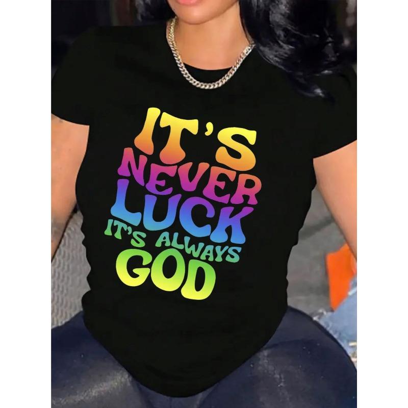 Women It's Never Luck It's Always God T-Shirt Colorful Print Crew Neck Short Sleeve Heavy Cotton Casual Top