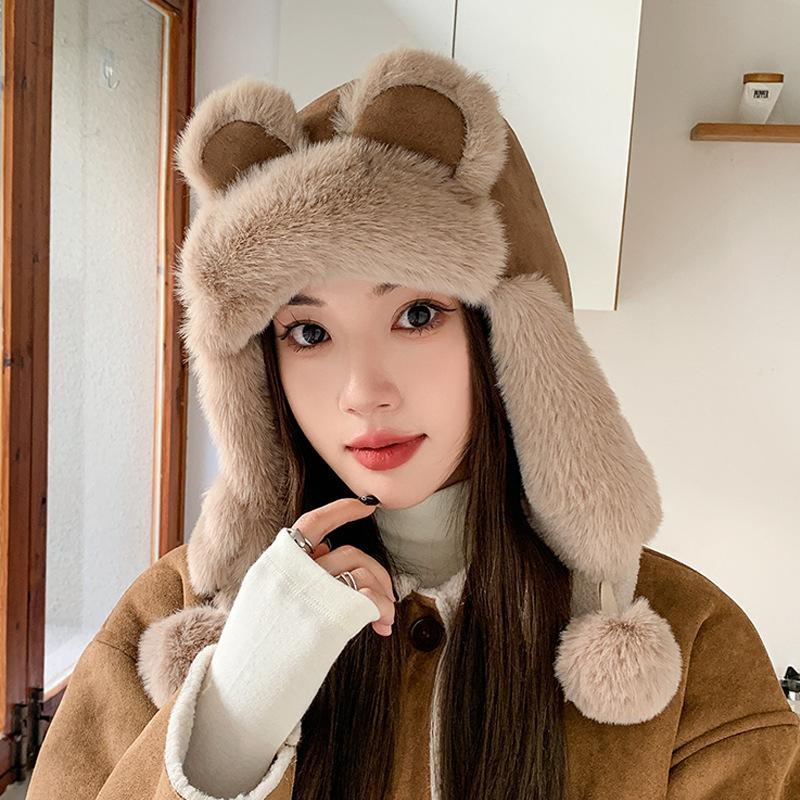 Cute Hat Female Winter Warm Lei Feng Hat Ear Protector Hairball Plush Hat Big Head Circumference Hat