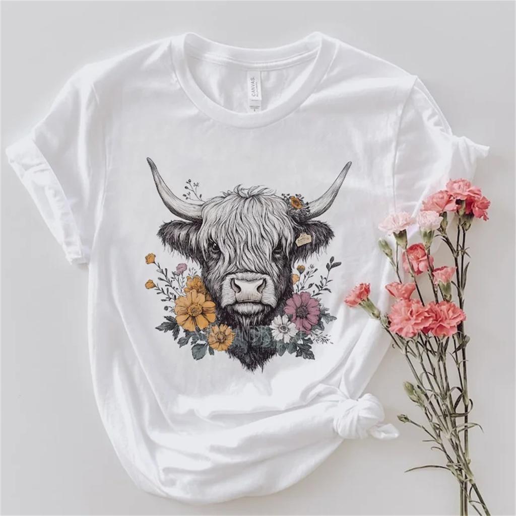 Cow Head Flower Summer Women's Short Sleeved Round Neck Women's Regular T-Shirt Fashionable Printed Pattern Retro Casual Top