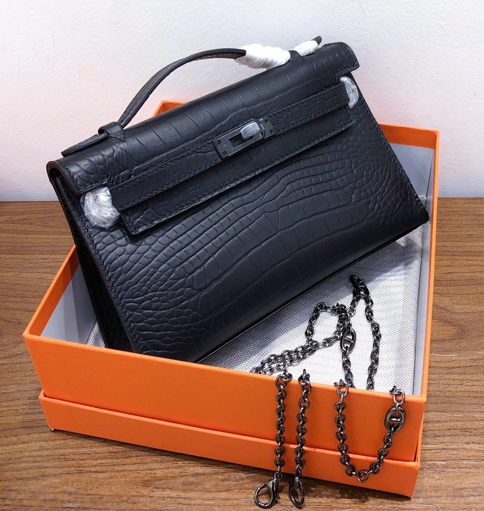 Primeira camada de couro de vaca, totalmente preta, padrão de crocodilo fosco, geração de bolsa Kelly