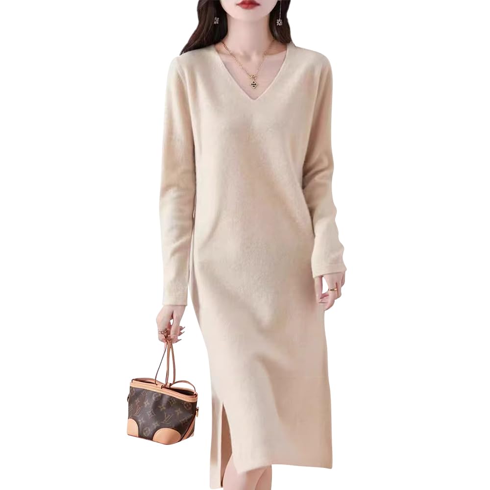 O vestido de lã com decote em V da PHOLEEY é um item essencial para o outono e inverno, apresentando um design simples, porém sofisticado.. Feito de lã 100% macia e quente, é confortável mesmo na estação fria. O decote em V valoriza o seu colo e apresenta uma fenda para facilitar o movimento, criando uma silhueta feminina.. Este vestido versátil é perfeito para uma variedade de ocasiões, desde o trajeto para o trabalho, encontros e noites com as amigas.
