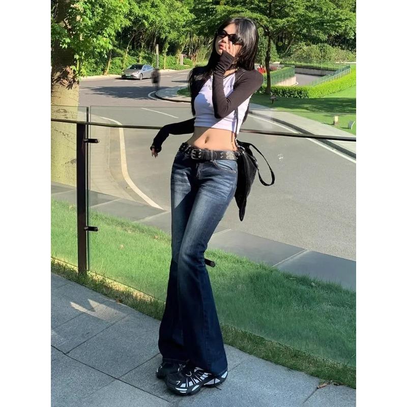 Women's Dark Blue High-Waisted Flared Jeans Slim-Fit Bell-Bottom Denim Pants