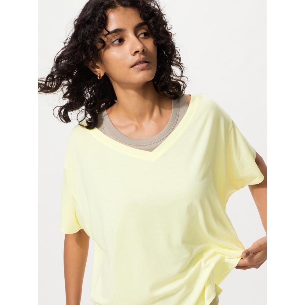 The UNIQLO Japan Air Rhythm Relax V-Neck T-Shirt features a 2WAY design with a V-neck and crew neck, allowing for wear from either direction. With a length that covers the hips, it's perfect for pairing with leggings, featuring a casually designed neckline of moderate depth. Additionally, it boasts a relaxed silhouette that provides comfort for everyone.