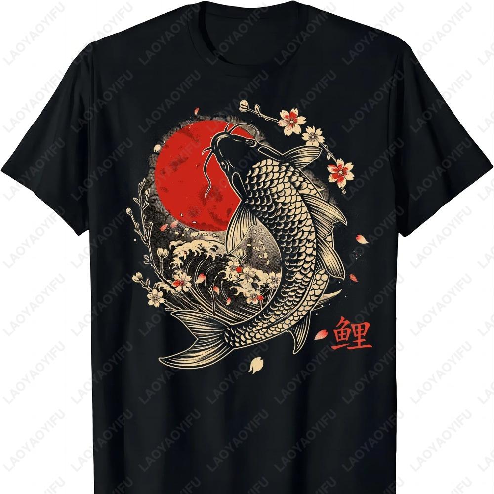 Cherry Blossom Koi Carp Fish Japanese Sakura Graphic Art TShirt Fashion Classic Style Oneck Tops Regular Cotton Men Clothing
