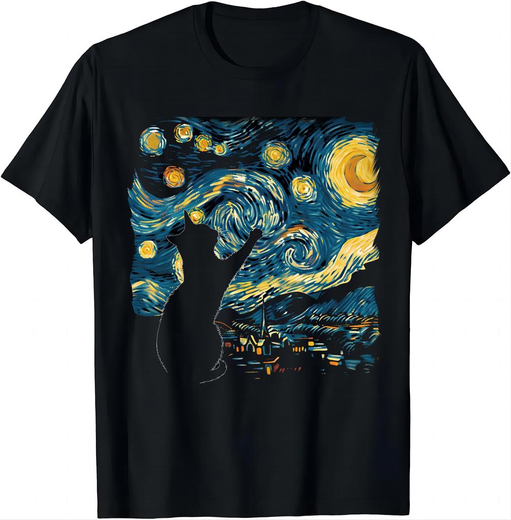 Cat Under The Starry Sky Print Tee Van Gogh Spirit Shirts Graphic T Shirts Mens Clothes Tops Camisas Streetwear Ropa Hombre