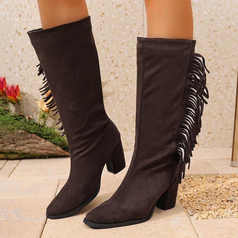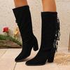 Tassel Block Heel Tall Boots Fashion Round Toe Side Zip Non-Slip High Heel Shoes for Women