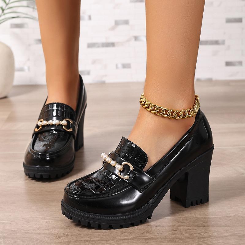 Block Heel High Heels Women's Spring and Autumn Patent Leather Platform Deep Mouth Single Shoes