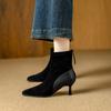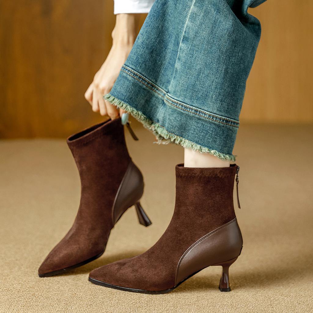 High Heel Short Boots Thin Heel Pointed Skinny Boots Suede Splicing Coffee Boots Medium Boots
