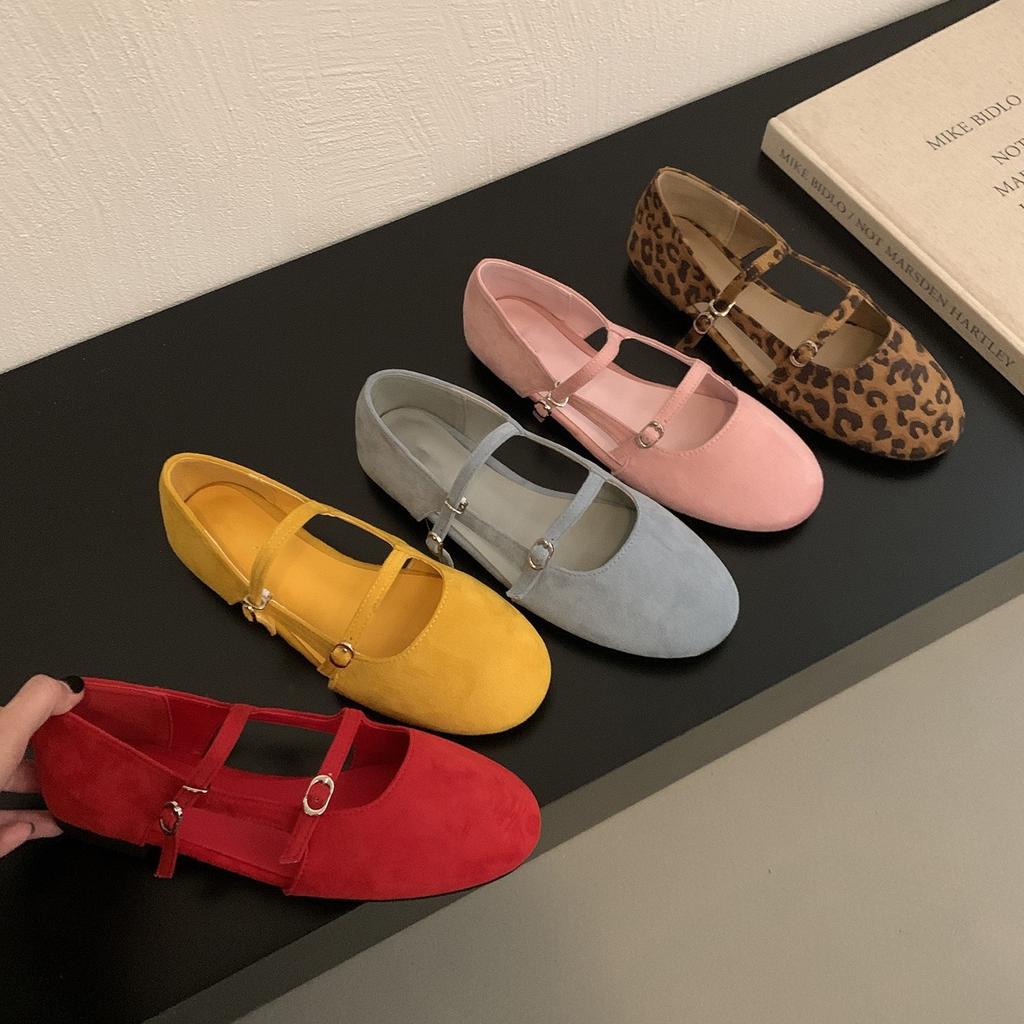French suede hollow Mary Jane shoes 2025 spring and summer one-word buckle belt hollow flat soft-soled ballet shoes