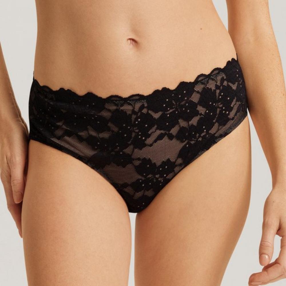 The HANRO High-Cut Lace Midi Brief (70906 - black beauty / deep poppy) is made from soft, lightweight floral mesh lace, giving a delicate and elegant feel. Its high-cut design enhances the leg line, making it appear longer and slimmer, while the comfortable midi brief length allows for easy wear.