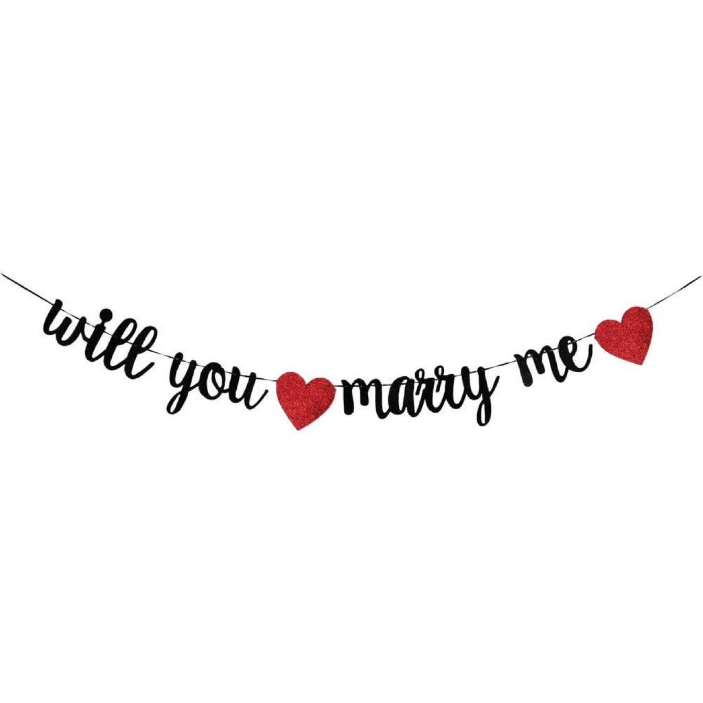 Will You Marry Me Banner,Black Gliter Garland With Two Red Hearts for Valentine's Day Wedding Marriage Proposal Engagement Party Decorations(black).