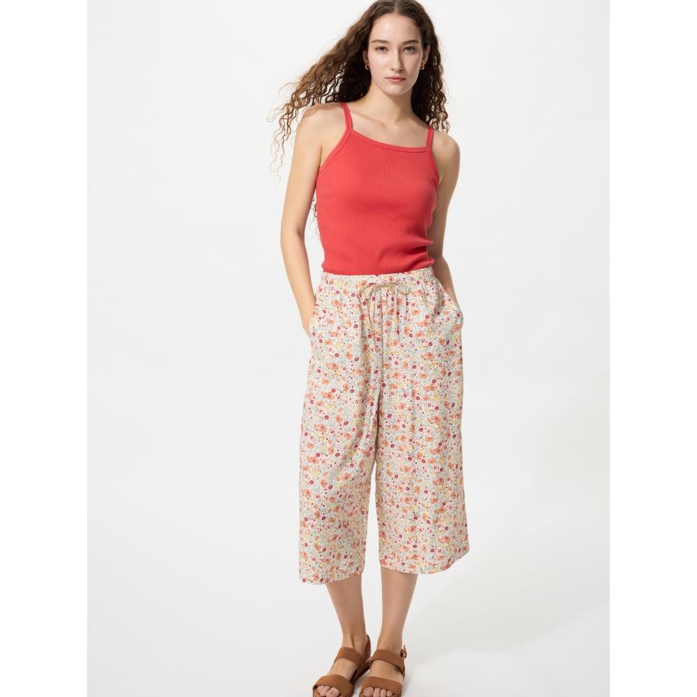The UNIQLO Japan Rayon Lilac features a cropped style, allowing for a comfortable wear during summer. It is characterized by its vibrant color and elegant silhouette, providing a comfortable wearing experience. This product includes pockets for practicality.