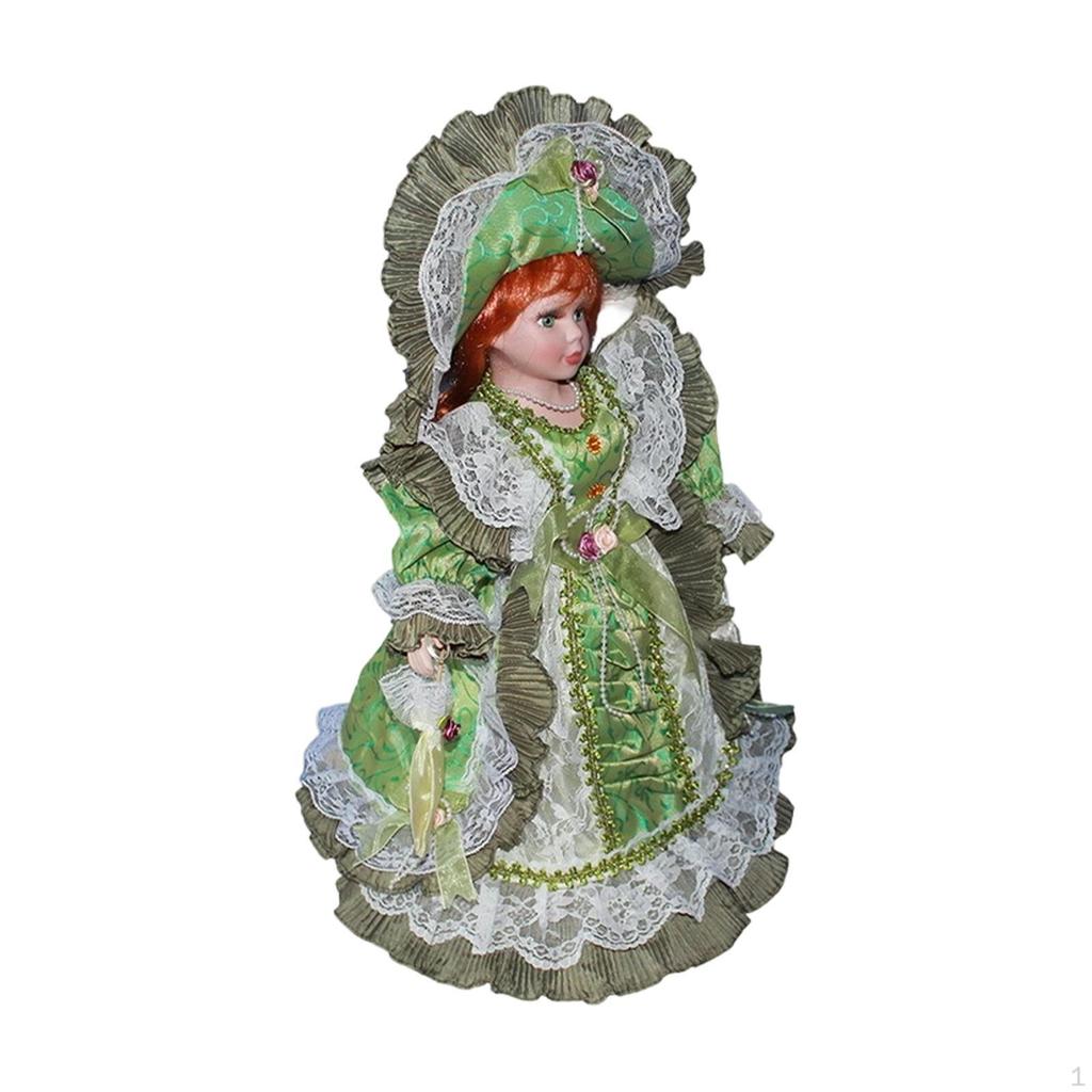 - 【Estilo adorável】: Boneca de porcelana de pé, delicada e fofa, vestindo um longo vestido verde e chapéu, possui acabamento e detalhes finos, ótima para decorações de casa