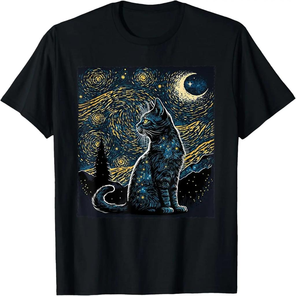 Gato Noite Estrelada Van Gogh Amante de Gatos Presentes Gato Mãe, Gato Pai Camiseta