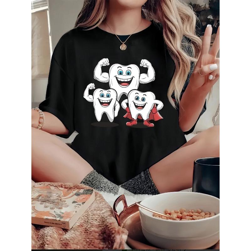 Women's Creative Healthy Teeth Print T-Shirt Casual Crew Neck Short Sleeve All-Season Top