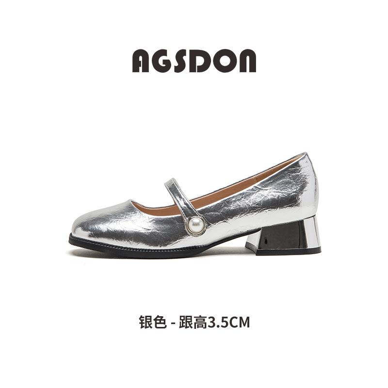 Silver thick heel single shoes new summer square head French retro Mary Jane small leather shoes