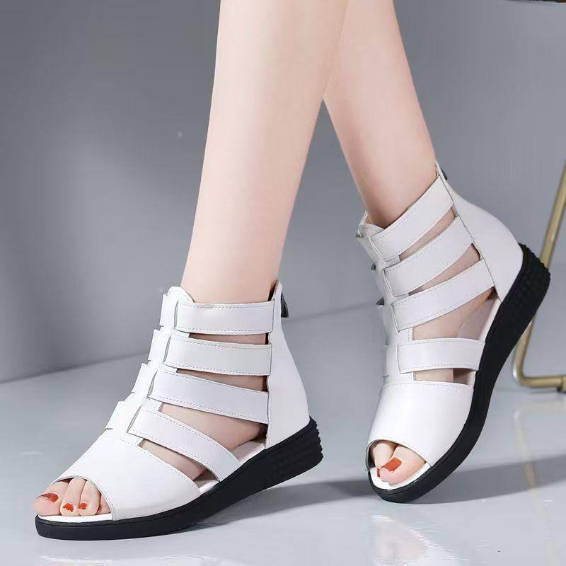 Women's Big Size Leather Hollow Out Wedges Peep Toe Sandals Summer New Soft Sole Non Slip Breathable High Top Zippers Cool Boots
