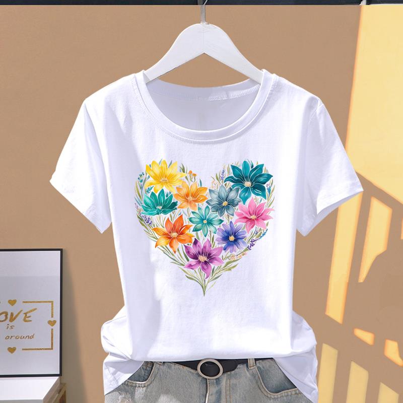 (Asian Size) sweet flower style T-shirts Female Casual Short Sleeve O-neck Fashion Graphic Tee Print Women's Top T Clothing