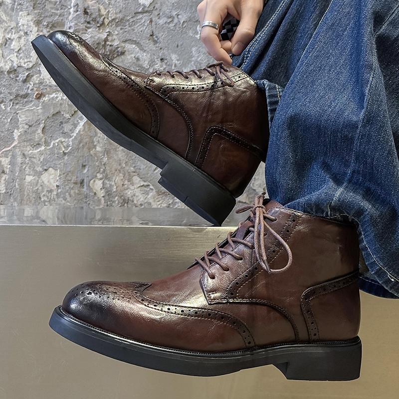 Men's high top leather shoes classic retro brogue style Autumn and Winter Outdoor Daily Business Office Black brown short boots
