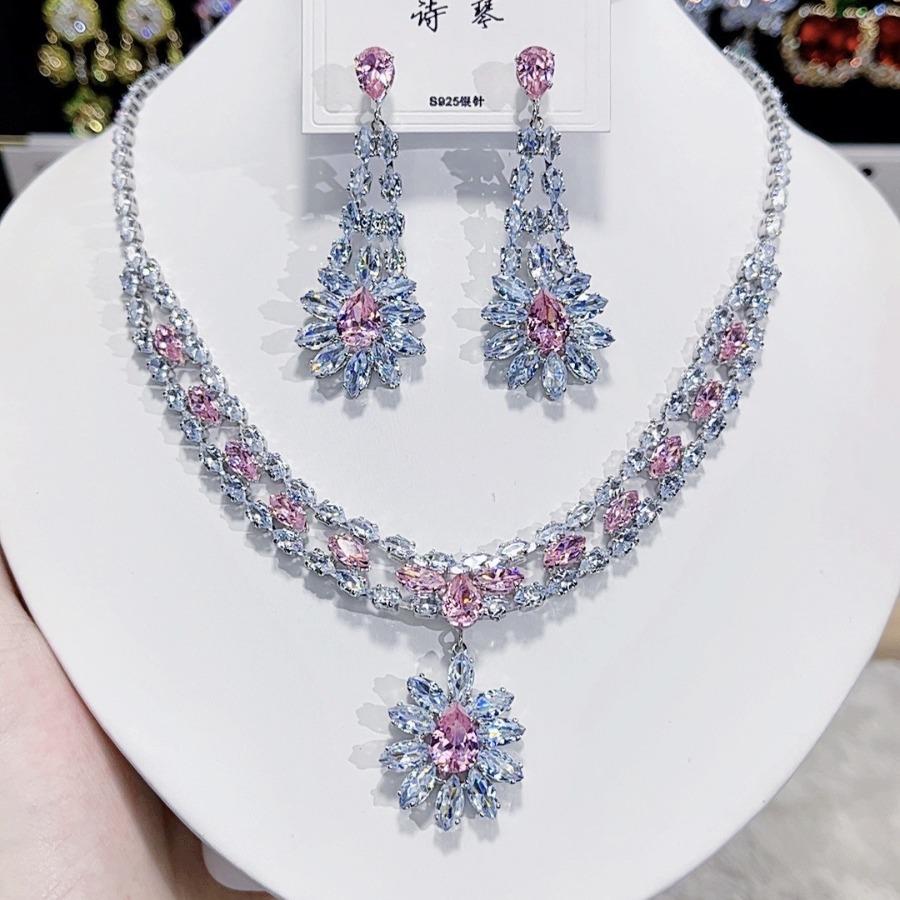 Women's Fashion Luxury Zirconia Crystal Pink Necklace Earrings Set Bracelet Jewelry Set Bridal Wedding Banquet Party Holiday