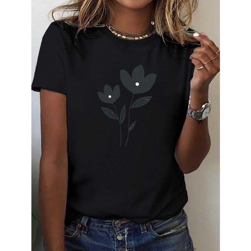 Women Minimalist Black White Round Neck Short Sleeve T-Shirt Line Art Tulip Floral Print 100% Soft Breathable Relaxed Fit Lightweight