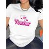 European Size Womens Black Polyester T Shirt Pink Heart Book Teacher Print Round Neck Durable Comfortable Fit Casual Daily Wear Top