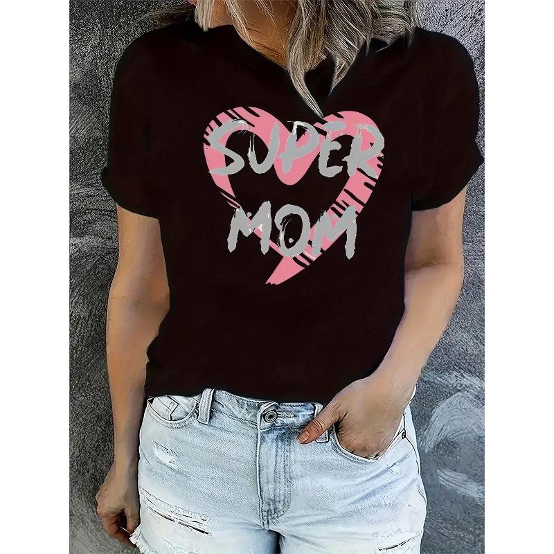 European sizes Women's Fashionable Trendy Round Neck Short Sleeve T-Shirt with Simple English "Super Mom"