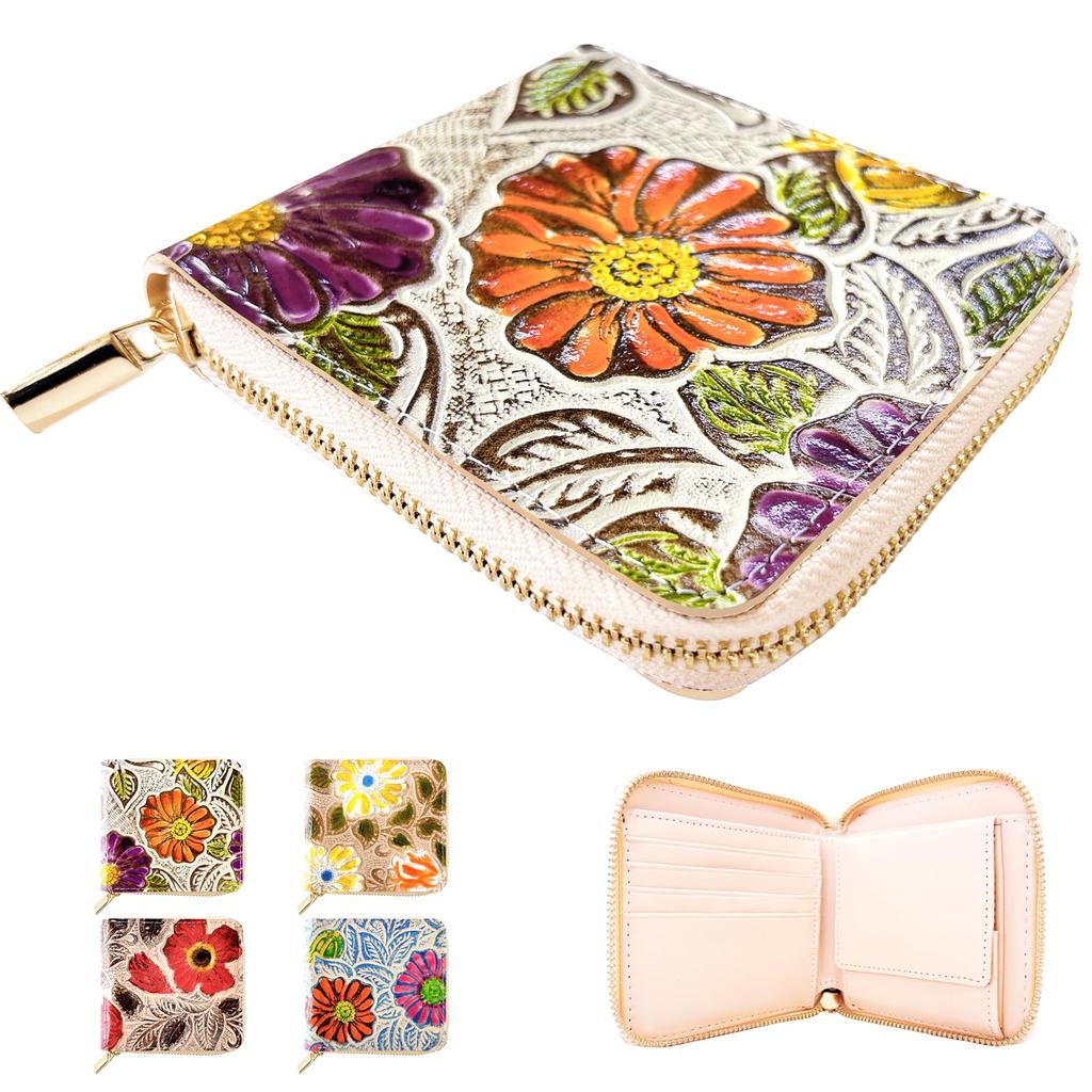 Carteira Bifold Feminina Tendência Yamagishi, Couro Genuíno de Vaca, Zíper Redondo, Compacta, Estampa Floral de Alta Qualidade, Embossada Floral Retrô,