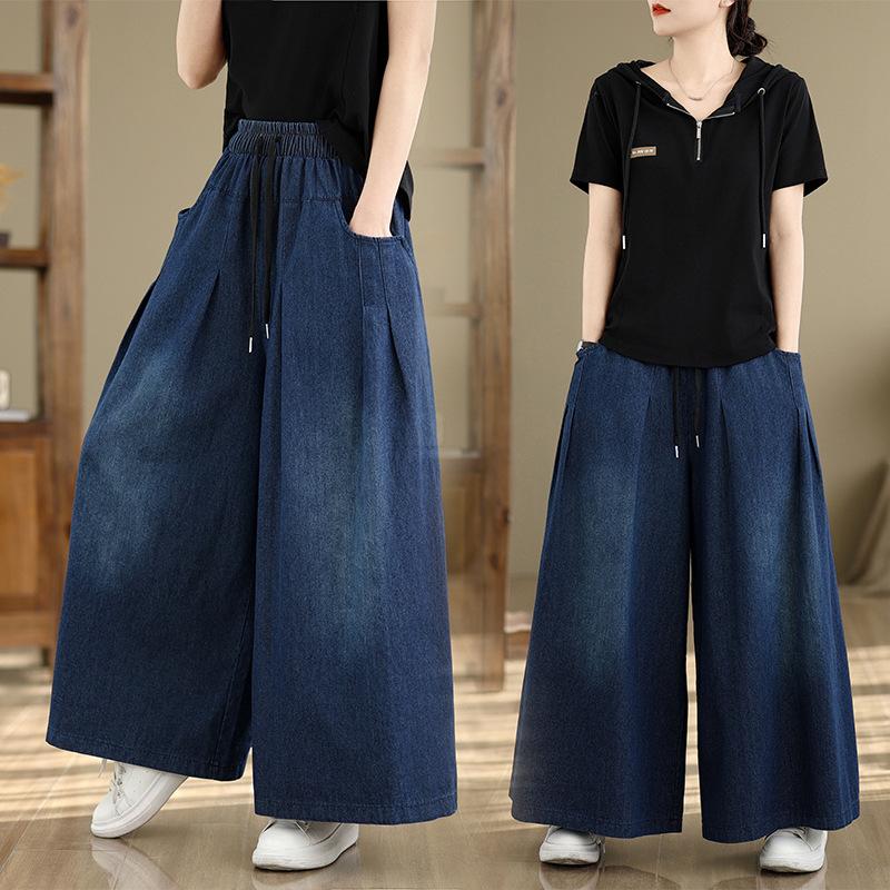 Retro Blue Denim Wide-leg Pants Women's New High-waisted Loose and Thin Large Size Casual Drape Trousers