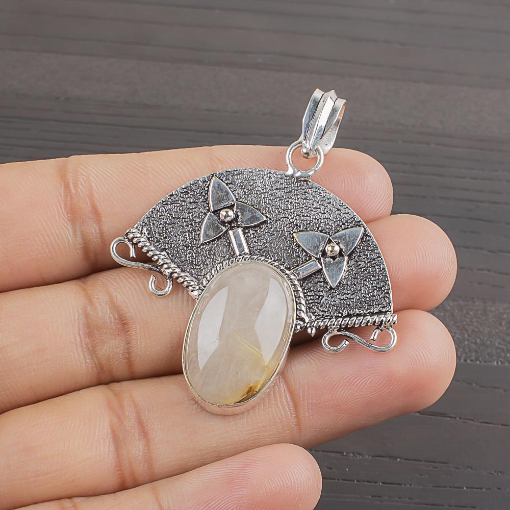 Natural Golden Rutile Gemstone 925 Sterling Silver Jewelry Designer Pendant 1.7" AJP-2006