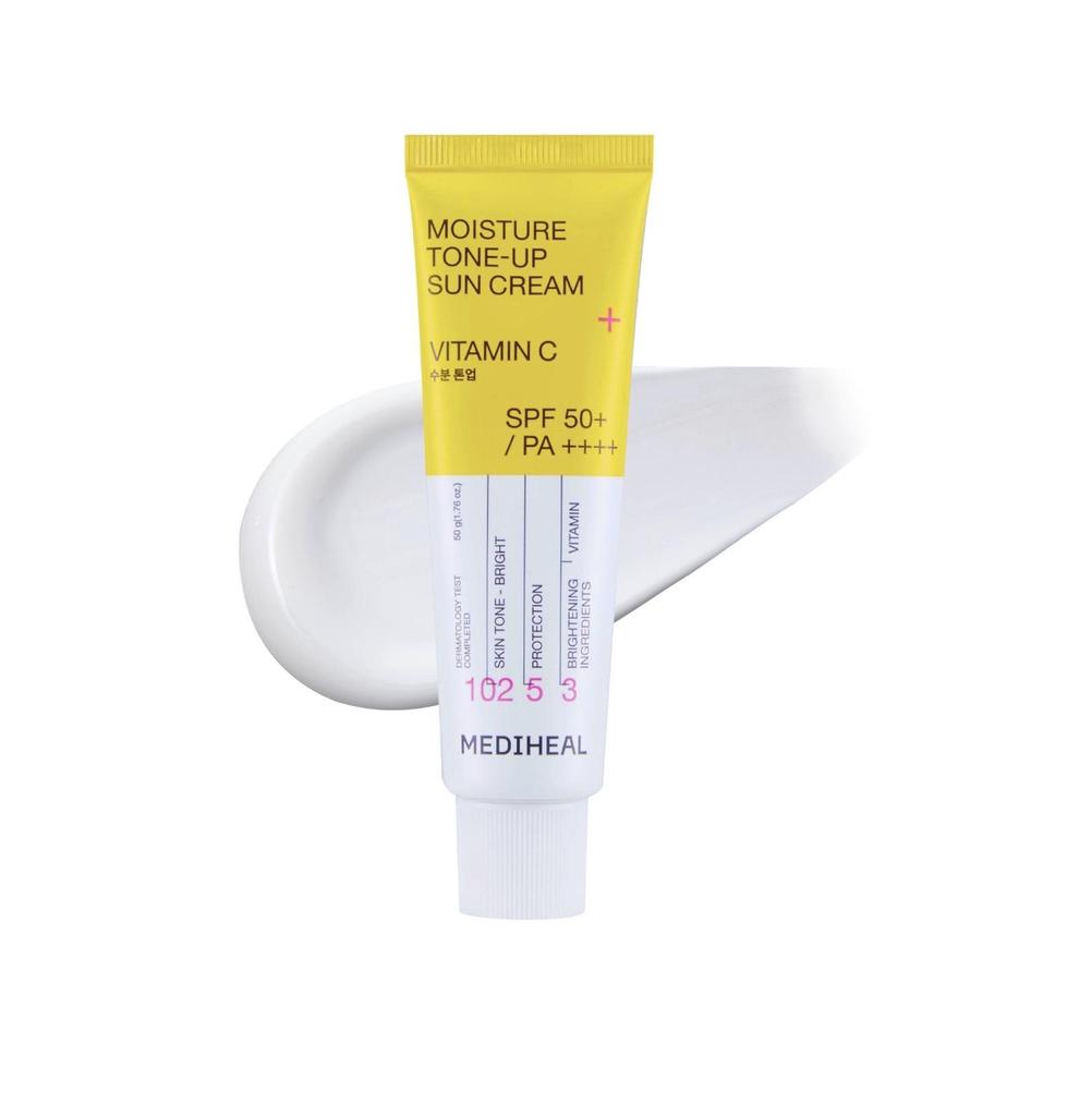 MEDIHEAL Moisture Tone-Up Sun Cream Vitamin C is a brightening sunscreen that protects and perfects your skin in one step. With powerful SPF50+ PA++++ broad-spectrum protection, it shields against harmful UVA and UVB rays while instantly tone-up brightening the complexion for a fresh, radiant look.