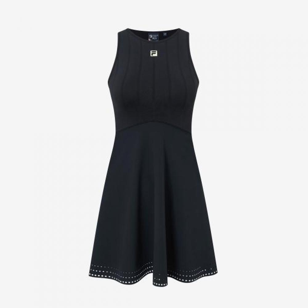 The Fila Pro Player Tennis Seamless Dress FS2OPH2391F_BLK is a woven mix tennis sleeveless dress made of lightweight nylon spandex material. It offers excellent mobility during tennis workouts and uses high-quality seam-free fabric. It comes with a separate pair of shorts, and is part of the tennis wear line worn by top Fila global tennis players. This product is designed to emphasize lightweight and elasticity, providing optimized mobility and comfort during tennis swings and movements. The seamless fabric minimizes skin irritation. The color is black (BLK).